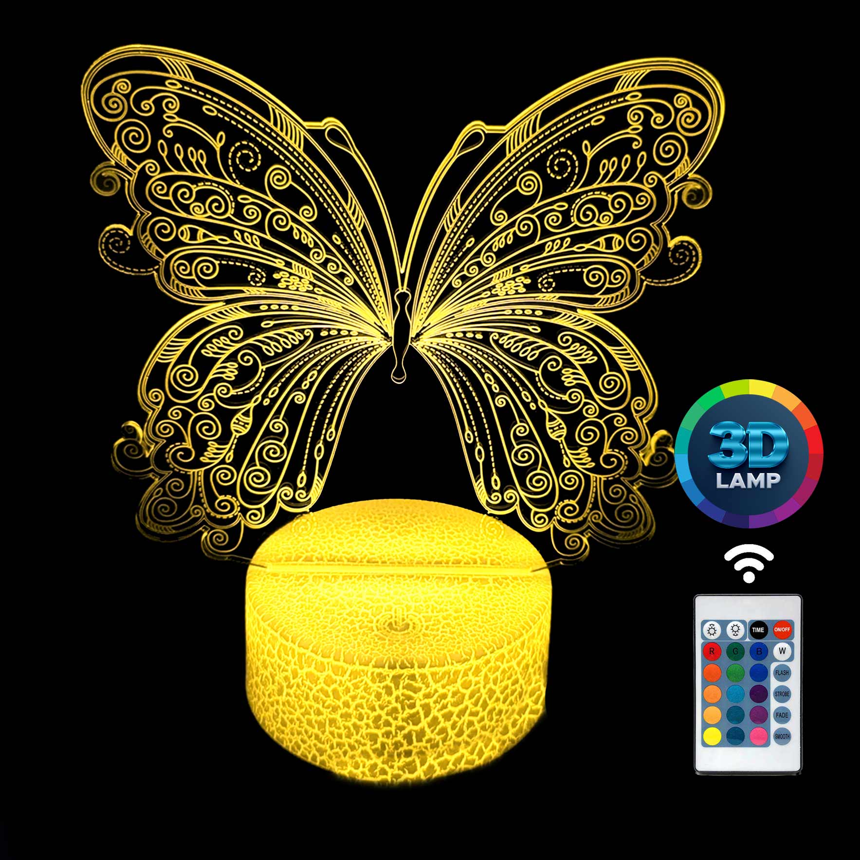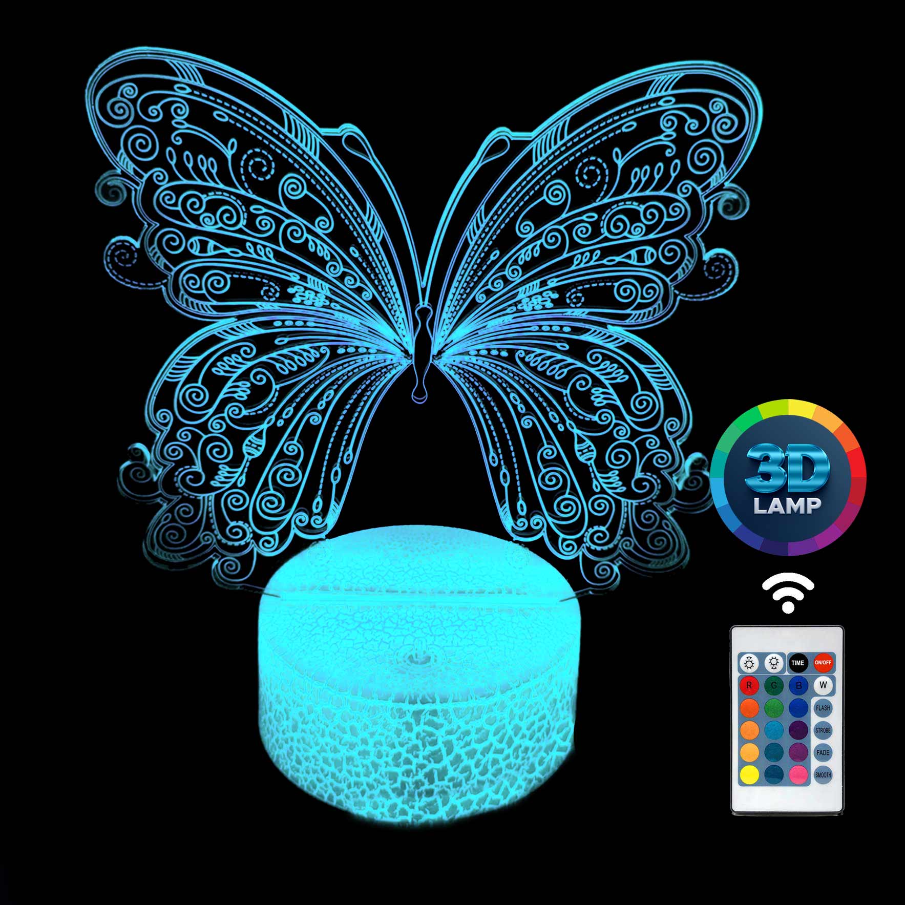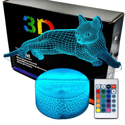 Lampka nocna 3D LAMP LED świeci w 16 kolorach (obsługa pilotem), 7 kolorach przy użyciu guzika na bazie (jest to lampka najnowszej generacji). Lampka LED może świecić w jednym stałym, wybranym kolorze (zależnie od Twojego wyboru) lub w trybie zmiennym (zmieniające się odcienie delikatnie lub pulsująco). Lampka się nie nagrzewa, istnieje możlwość ustawienia natężenia oświetlenia (rozjaśnianie i przyciemnianie – pierwsze dwa guziki po lewej na pilocie).