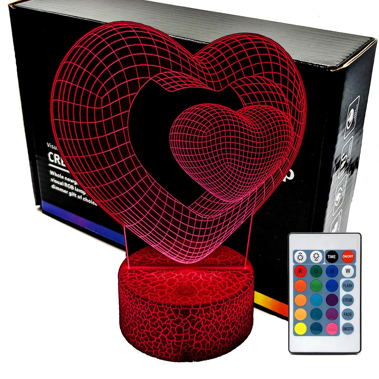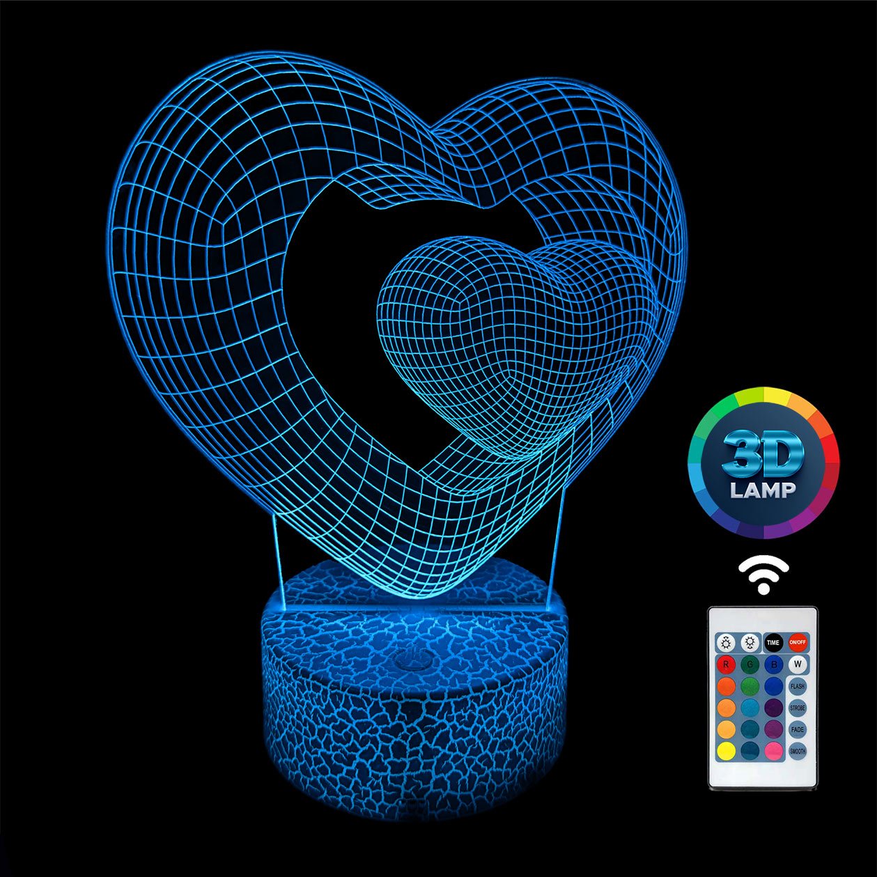 Lampka nocna 3D LAMP LED świeci w 16 kolorach (obsługa pilotem), 7 kolorach przy użyciu guzika na bazie (jest to lampka najnowszej generacji). Lampka LED może świecić w jednym stałym, wybranym kolorze (zależnie od Twojego wyboru) lub w trybie zmiennym (zmieniające się odcienie delikatnie lub pulsująco). Lampka się nie nagrzewa, istnieje możlwość ustawienia natężenia oświetlenia (rozjaśnianie i przyciemnianie – pierwsze dwa guziki po lewej na pilocie).