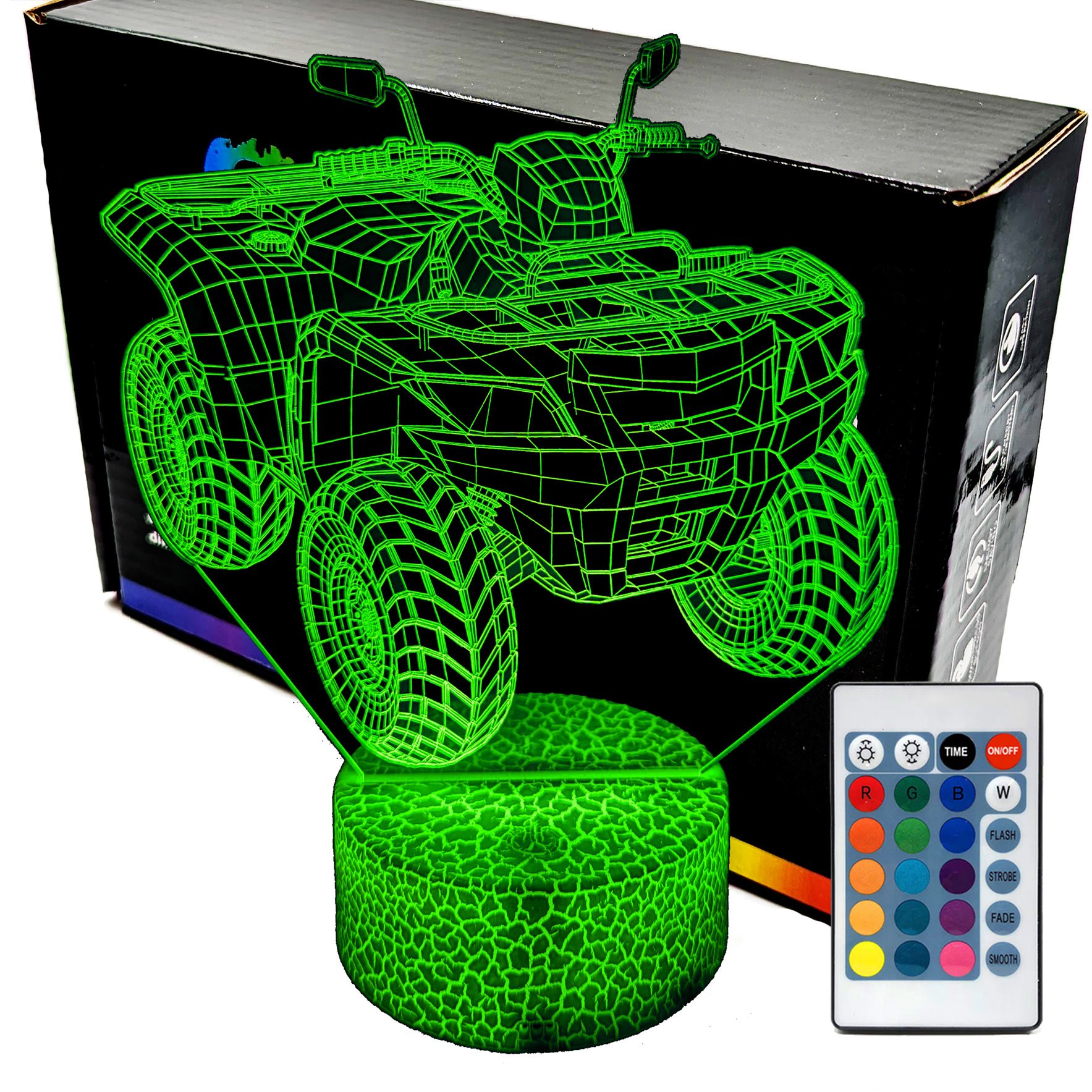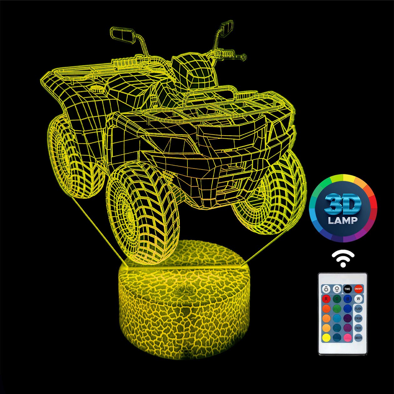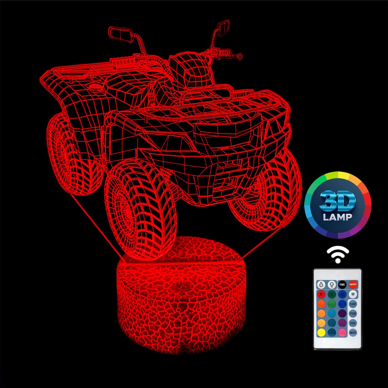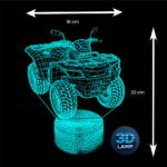 Lampka nocna 3D LAMP LED świeci w 16 kolorach (obsługa pilotem), 7 kolorach przy użyciu guzika na bazie (jest to lampka najnowszej generacji). Lampka LED może świecić w jednym stałym, wybranym kolorze (zależnie od Twojego wyboru) lub w trybie zmiennym (zmieniające się odcienie delikatnie lub pulsująco). Lampka się nie nagrzewa, istnieje możlwość ustawienia natężenia oświetlenia (rozjaśnianie i przyciemnianie – pierwsze dwa guziki po lewej na pilocie).