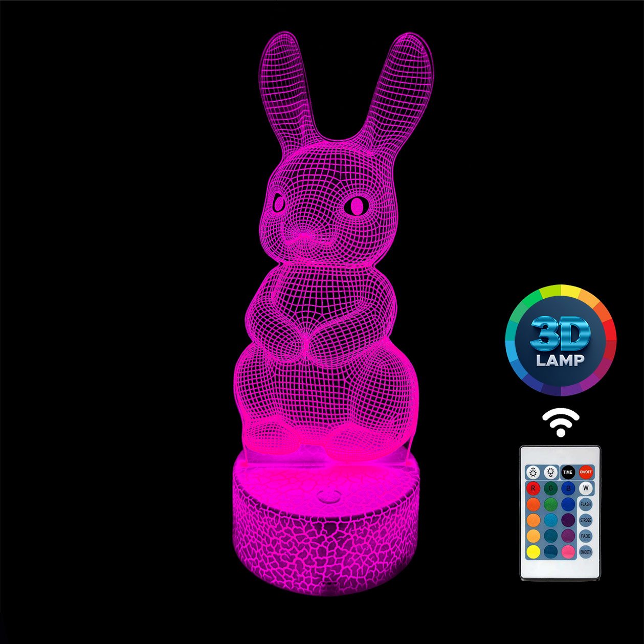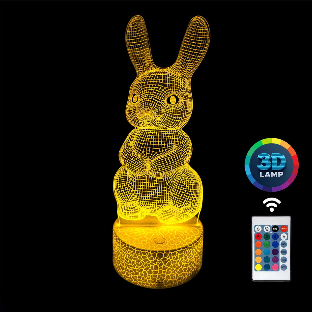 Lampka nocna 3D LAMP LED świeci w 16 kolorach (obsługa pilotem), 7 kolorach przy użyciu guzika na bazie (jest to lampka najnowszej generacji). Lampka LED może świecić w jednym stałym, wybranym kolorze (zależnie od Twojego wyboru) lub w trybie zmiennym (zmieniające się odcienie delikatnie lub pulsująco). Lampka się nie nagrzewa, istnieje możlwość ustawienia natężenia oświetlenia (rozjaśnianie i przyciemnianie – pierwsze dwa guziki po lewej na pilocie).