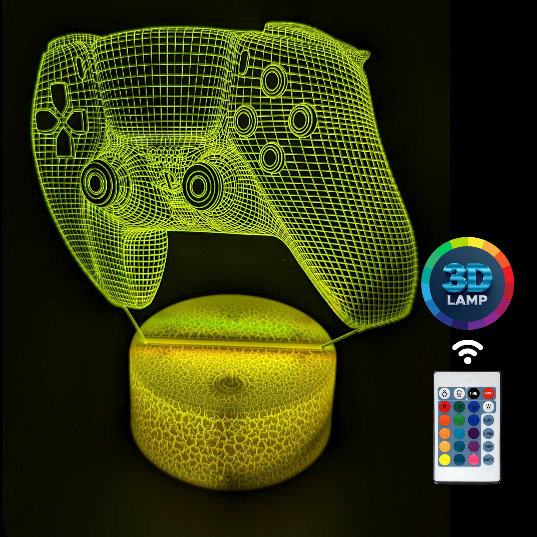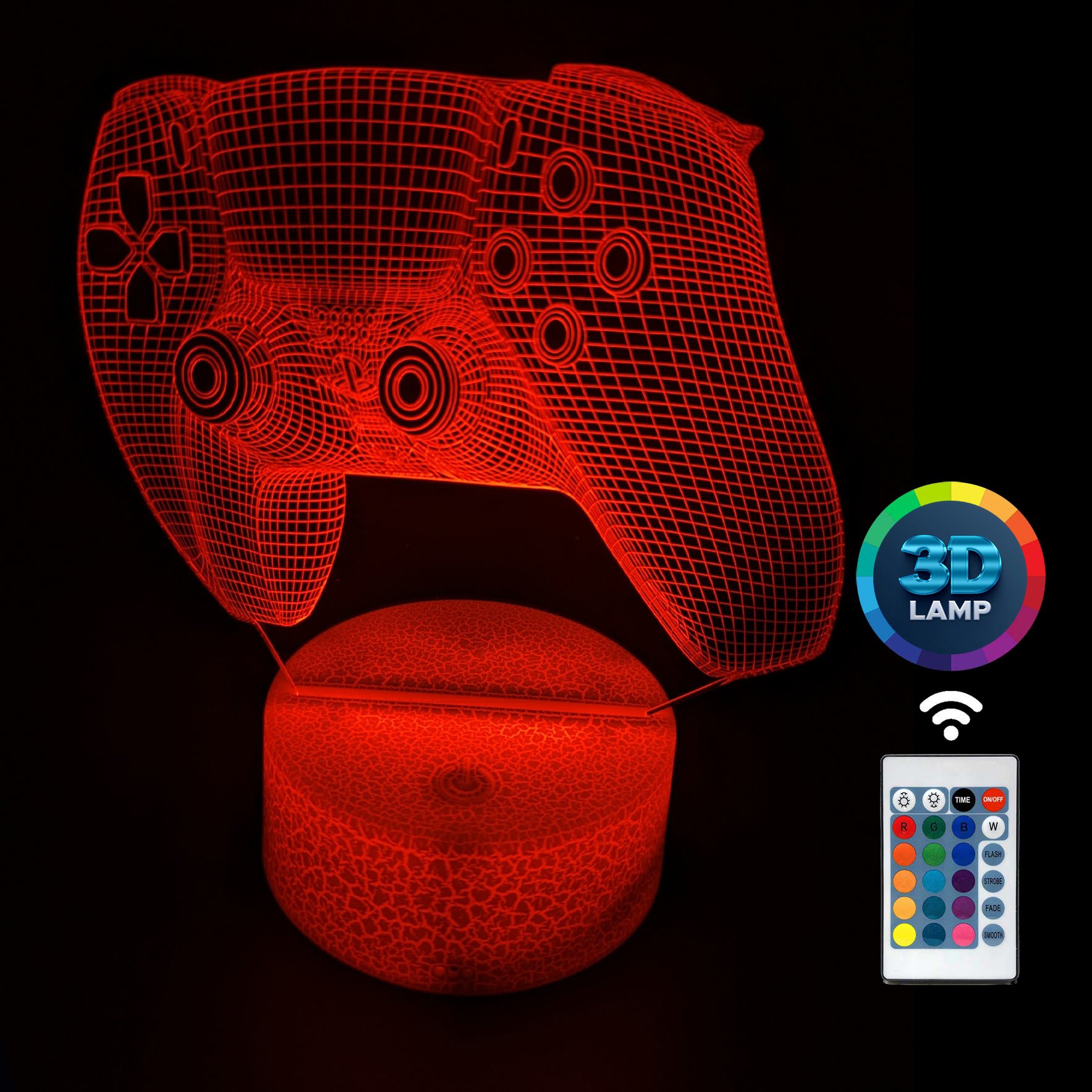 Lampka nocna 3D LAMP LED świeci w 16 kolorach (obsługa pilotem), 7 kolorach przy użyciu guzika na bazie (jest to lampka najnowszej generacji). Lampka LED może świecić w jednym stałym, wybranym kolorze (zależnie od Twojego wyboru) lub w trybie zmiennym (zmieniające się odcienie delikatnie lub pulsująco). Lampka się nie nagrzewa, istnieje możlwość ustawienia natężenia oświetlenia (rozjaśnianie i przyciemnianie – pierwsze dwa guziki po lewej na pilocie).