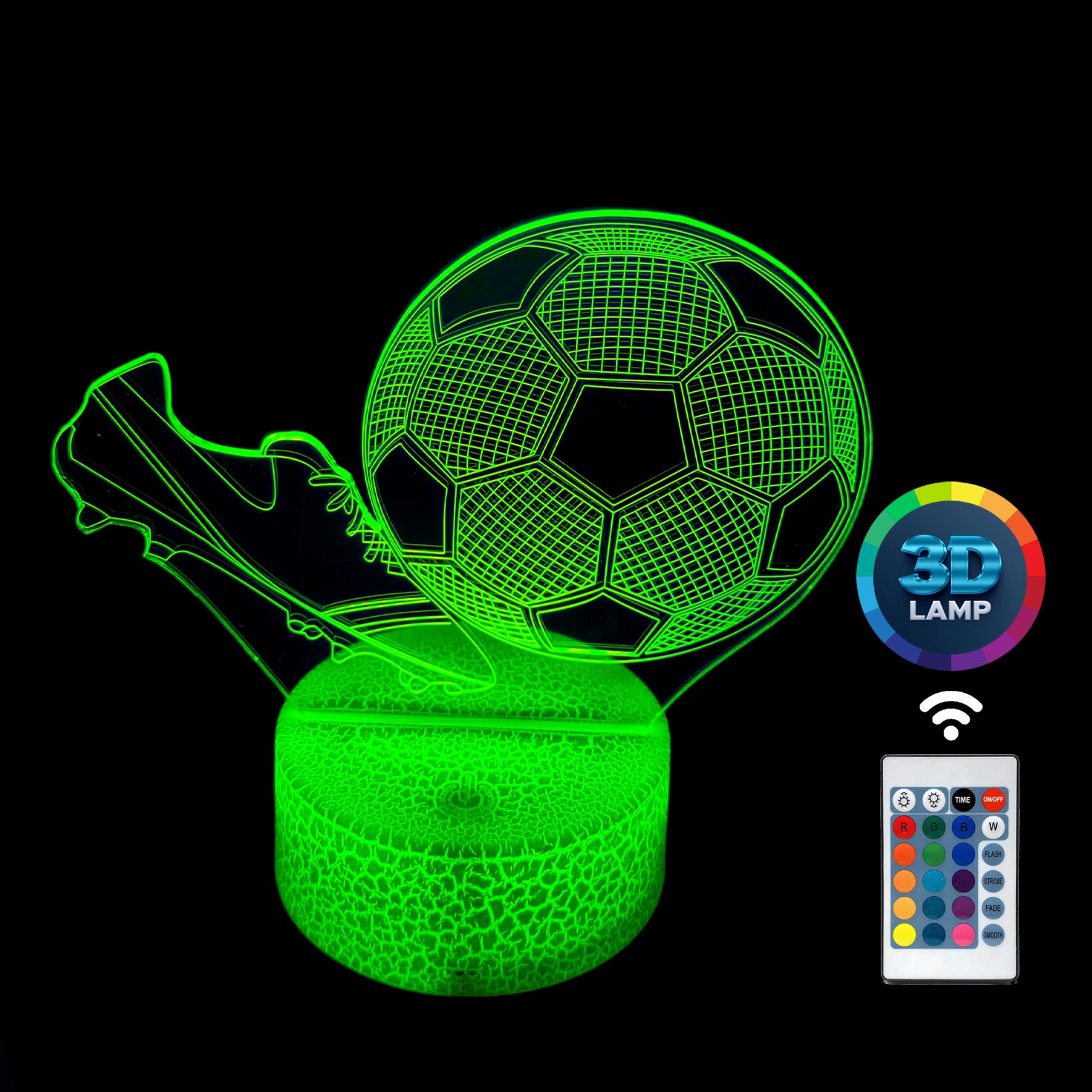 Lampka nocna 3D LAMP LED świeci w 16 kolorach (obsługa pilotem), 7 kolorach przy użyciu guzika na bazie (jest to lampka najnowszej generacji). Lampka LED może świecić w jednym stałym, wybranym kolorze (zależnie od Twojego wyboru) lub w trybie zmiennym (zmieniające się odcienie delikatnie lub pulsująco). Lampka się nie nagrzewa, istnieje możlwość ustawienia natężenia oświetlenia (rozjaśnianie i przyciemnianie – pierwsze dwa guziki po lewej na pilocie).