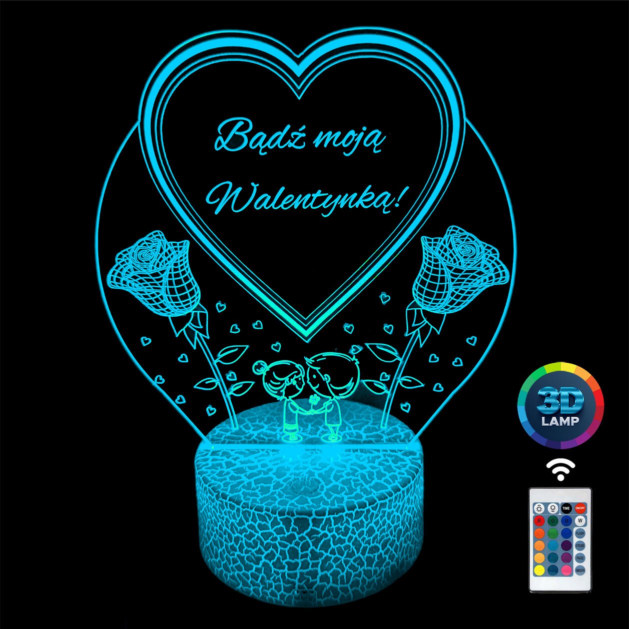 Lampka nocna 3D LAMP LED świeci w 16 kolorach (obsługa pilotem), 7 kolorach przy użyciu guzika na bazie (jest to lampka najnowszej generacji). Lampka LED może świecić w jednym stałym, wybranym kolorze (zależnie od Twojego wyboru) lub w trybie zmiennym (zmieniające się odcienie delikatnie lub pulsująco). Lampka się nie nagrzewa, istnieje możlwość ustawienia natężenia oświetlenia (rozjaśnianie i przyciemnianie – pierwsze dwa guziki po lewej na pilocie).